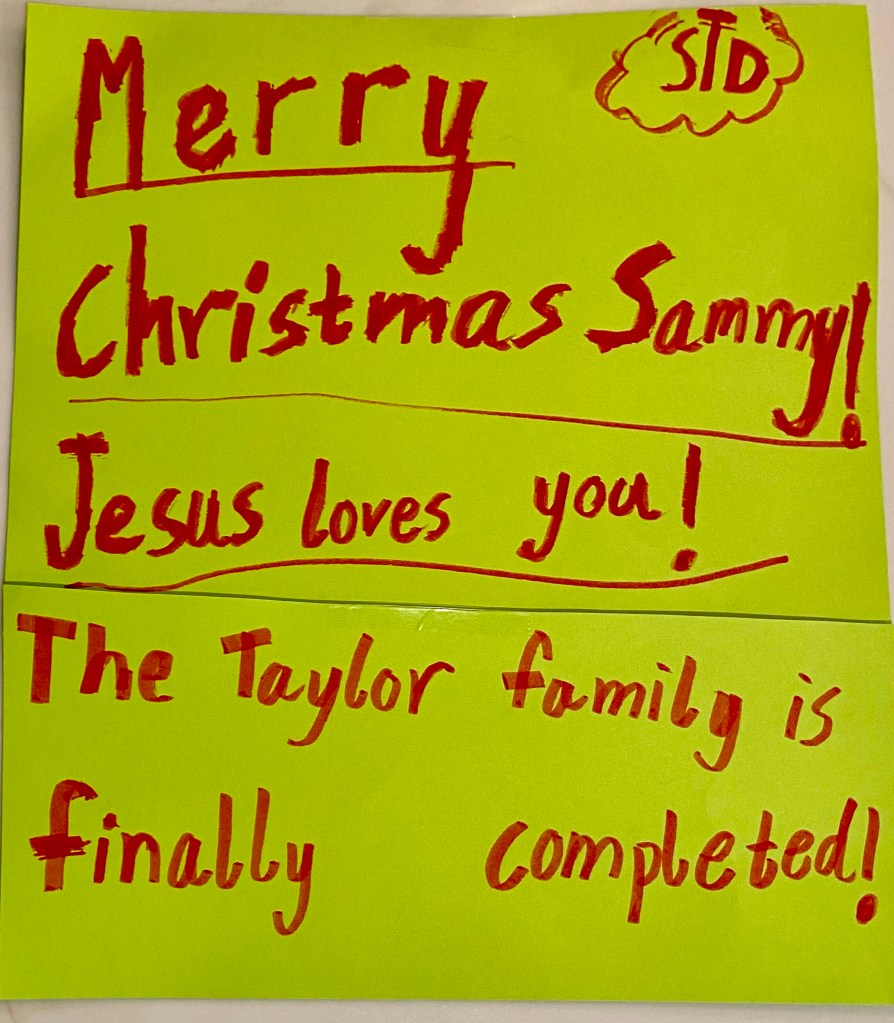Merry Christmas Katie!!! Miss and love you! I love the part about how surprised Anna was at how much Sammy loved her and how we will also be surprised at how much Jesus likes and loves us- that’s so very true!! I love that! Cathy
