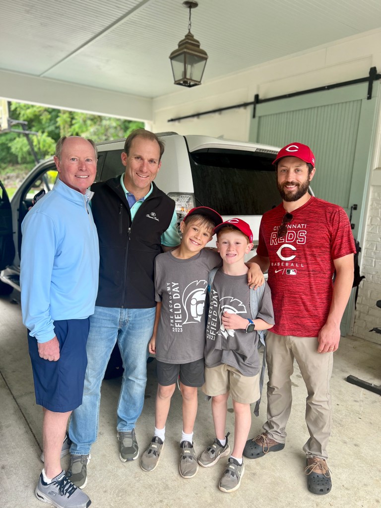 And come back is what my dad got to do this spring. John could pick anywhere to go for his 10th birthday (our family tradition, just for age 10) and after wearing a Reds jersey at the park, there was nowhere on the planet he’d rather go than to see the real Reds in Cincinnati. He loaded the car with his buddy, Coach David, Will and Fuzzy.